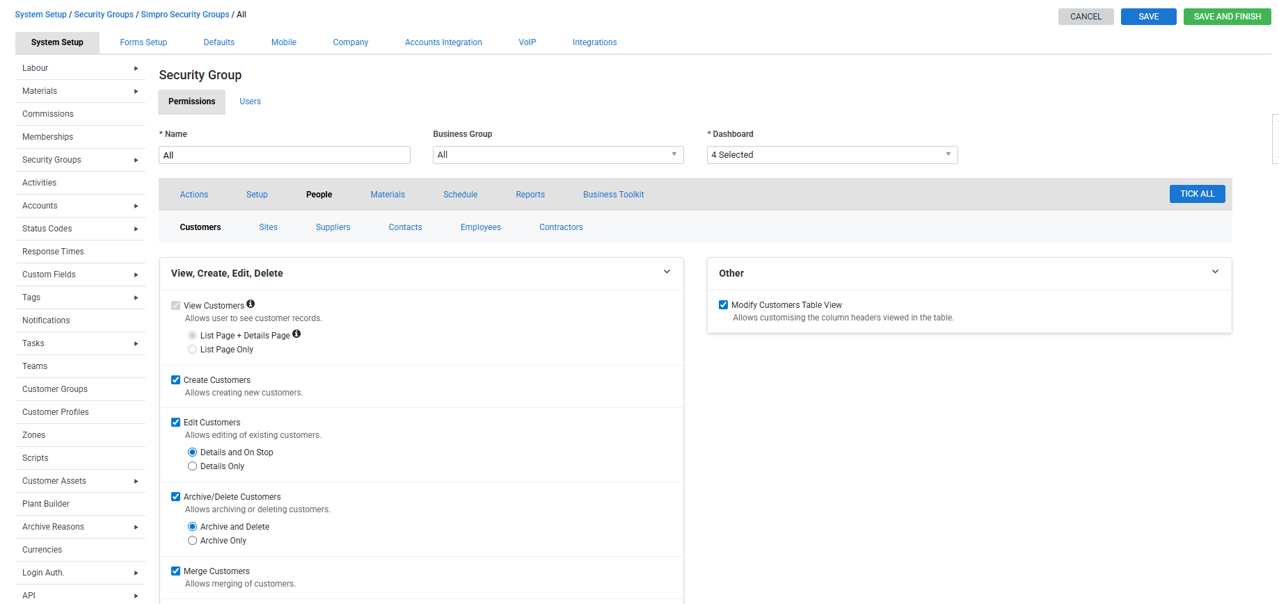 In System Setup > Security Groups > Simpro Security Group, we’ve added the People permissions tab. This gives you more control over what your employees can see or do when working with Customers, Sites, Suppliers, Contacts, Employees, and Contractors.