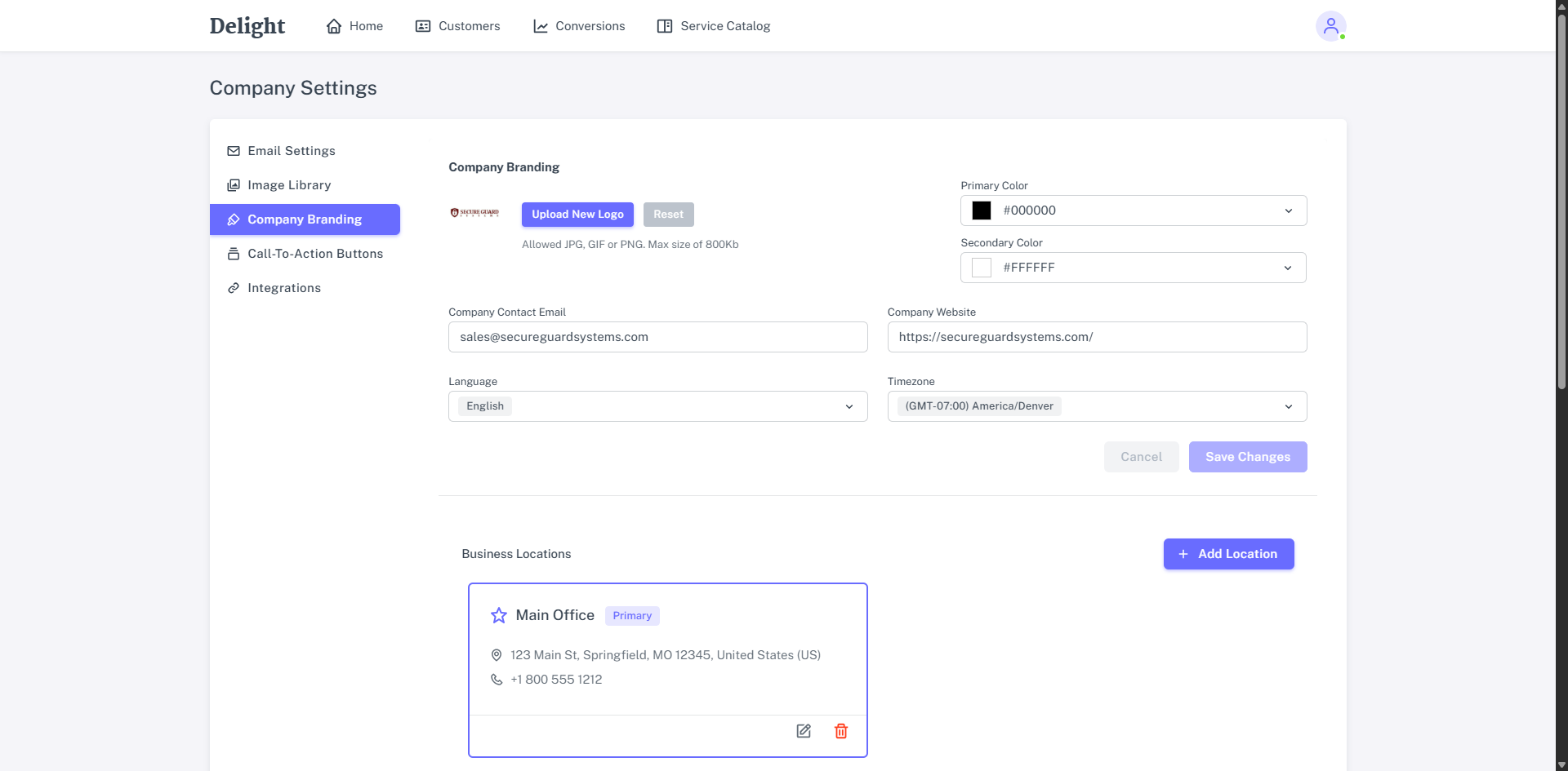 - Enter a Company Contact Email to set a reply-to email address for any outgoing emails delivered by Delight. This inbox is used for return emails from your customers, regardless of where emails appear to be sent from based on Company Setting > Send Emails From. Ensure to use the email address of an inbox that is monitored by your team.