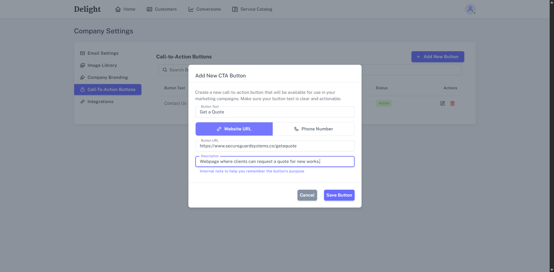 By default, Delight creates buttons that link to pages on your website or phone numbers where customers can contact your company and book work. Search for buttons as required, and click