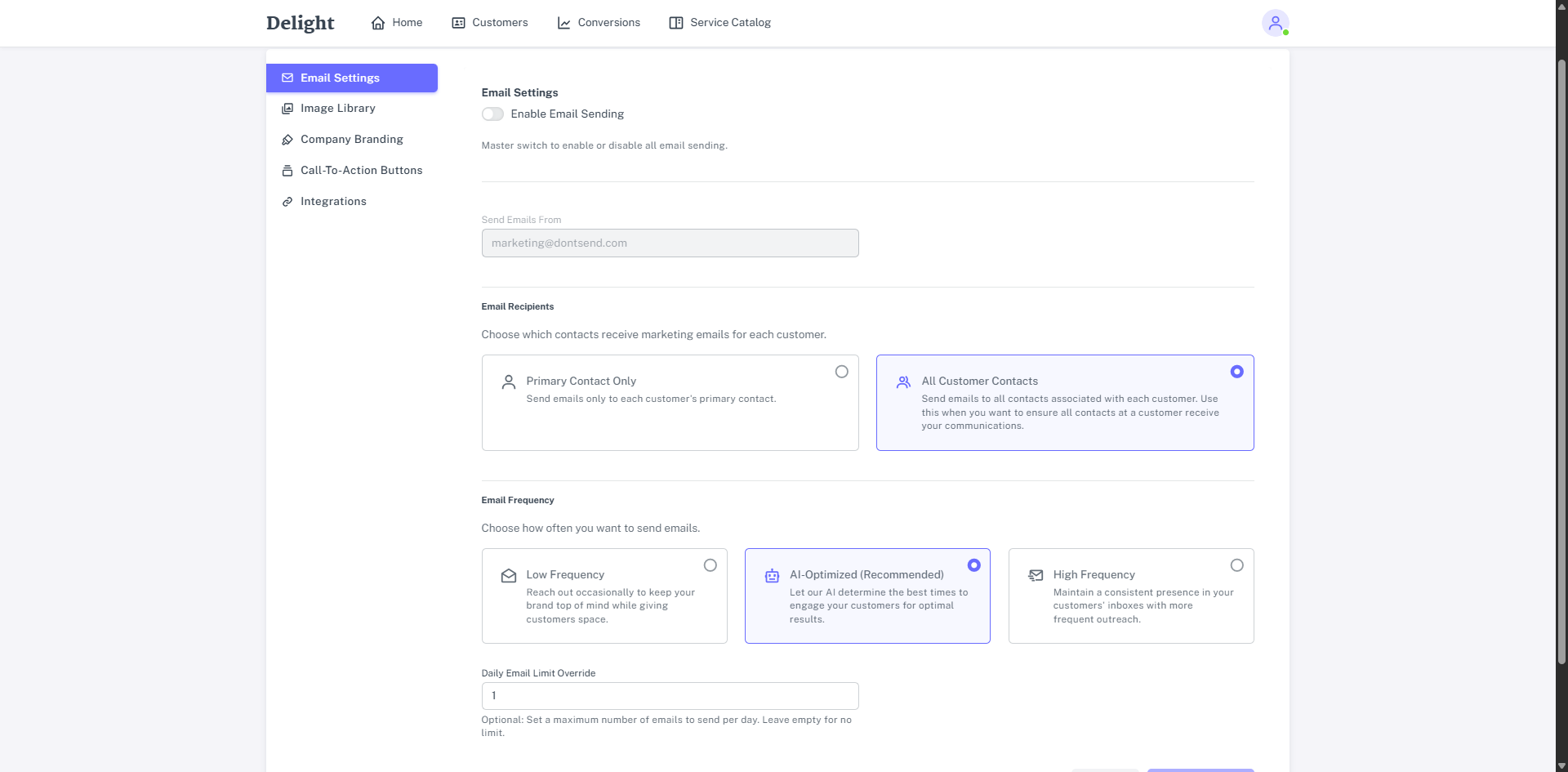 - Set a Daily Email Limit (Optional): Specify a maximum number of emails to generate for each sending day. This option is typically used when first launching Delight, so that each email can be reviewed as the system is being configured. It is not recommended that this field be used as a long-term option, as it will lead to low marketability customers not receiving emails due to the algorithm used to prioritize which customers to generate emails for each day.
