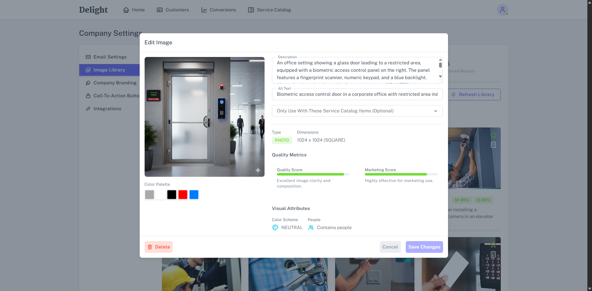 As images are added to Delight it’s AI reviews the images, records the various attributes, and generates a Description, Alternative Text and determines which catalogue items to use it with.