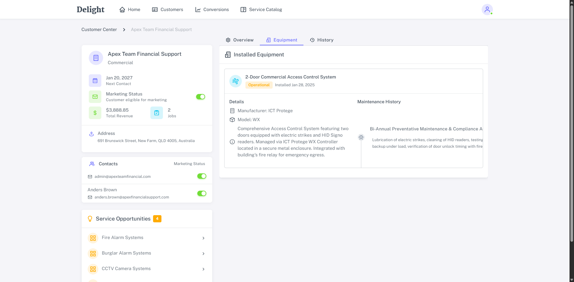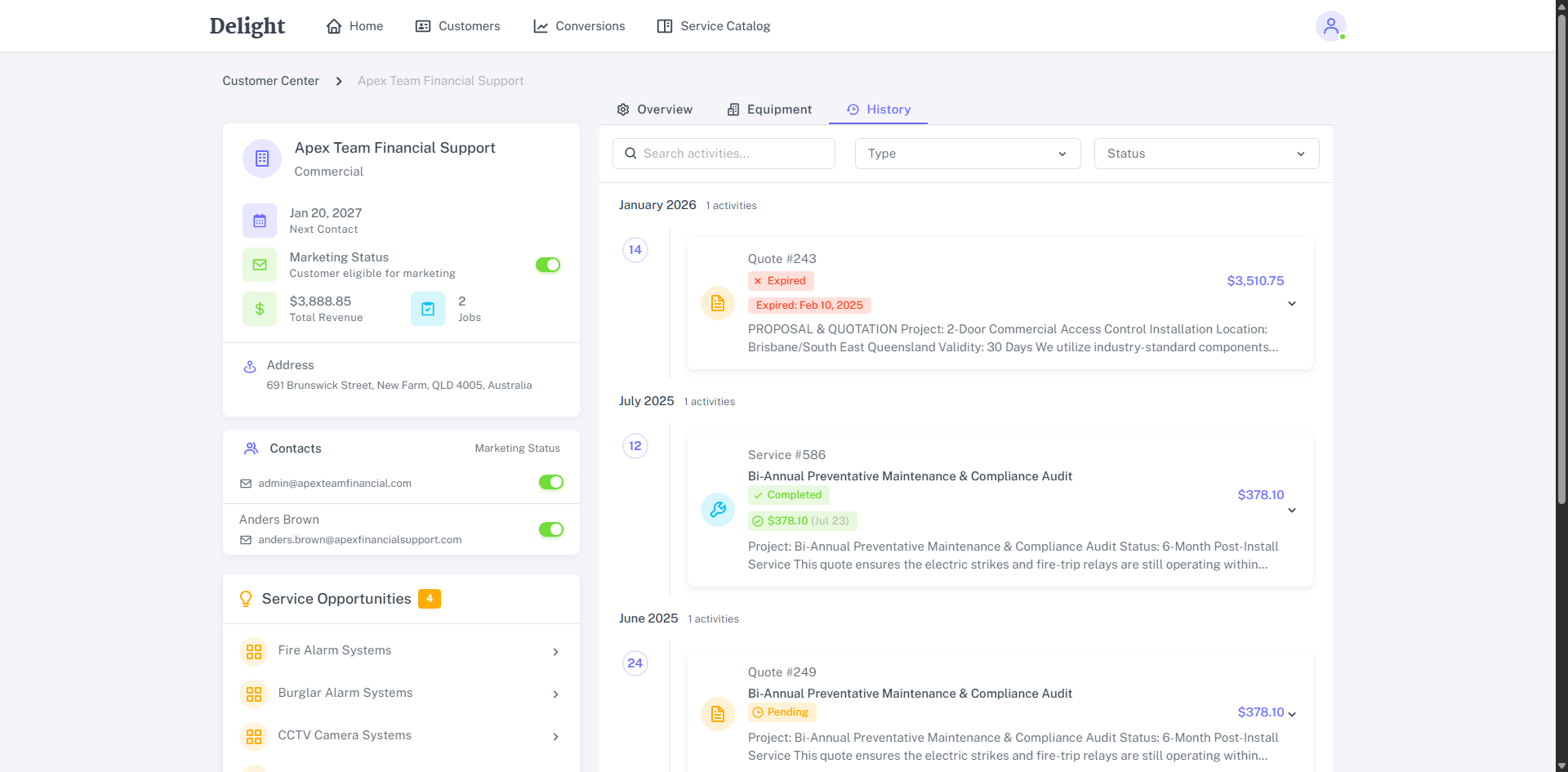 From the Customer page click on a customer to get a more detailed view of their details, contacts, service opportunities, email activities, equipment and history.