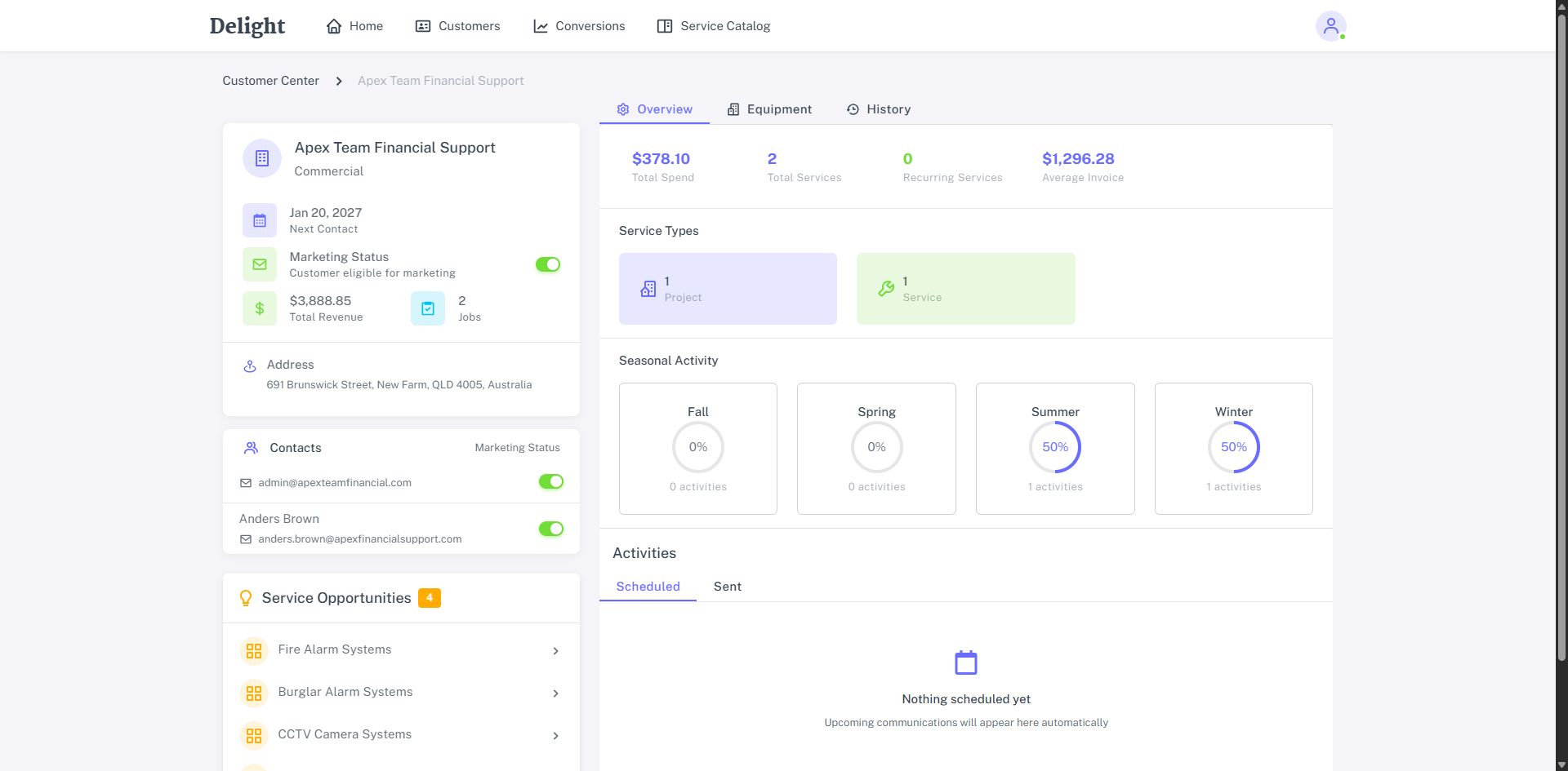 Filter and access customers to get a more granular view. See the total revenue, contact details, service opportunities, email activities, seasonal activity, equipment and the contact history of a customer.