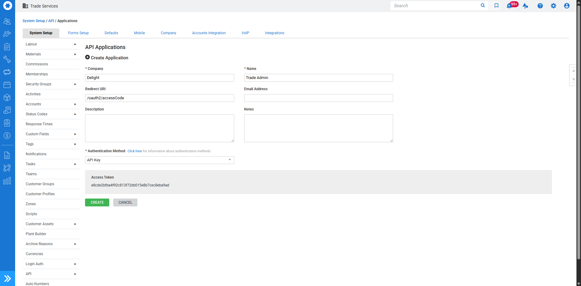 To integrate Delight with Simpro Premium and start generating emails Delight must be created as an API application in your Simpro Premium build. This will generate an API key Access Token that you can add to Delight to verify the integration.
