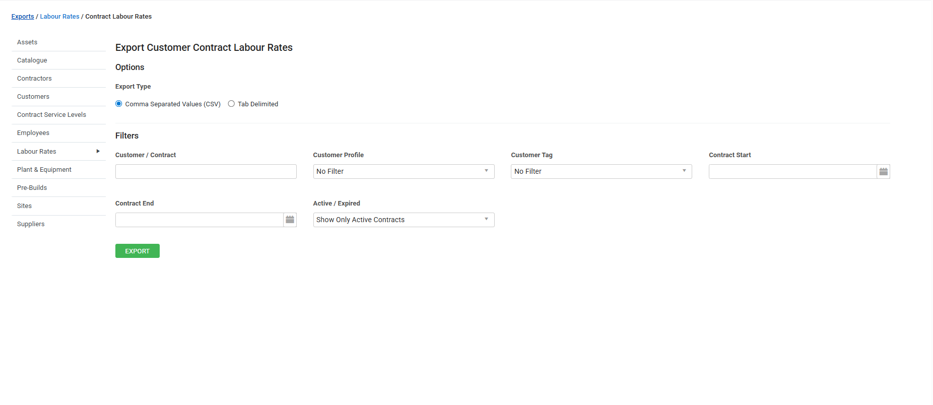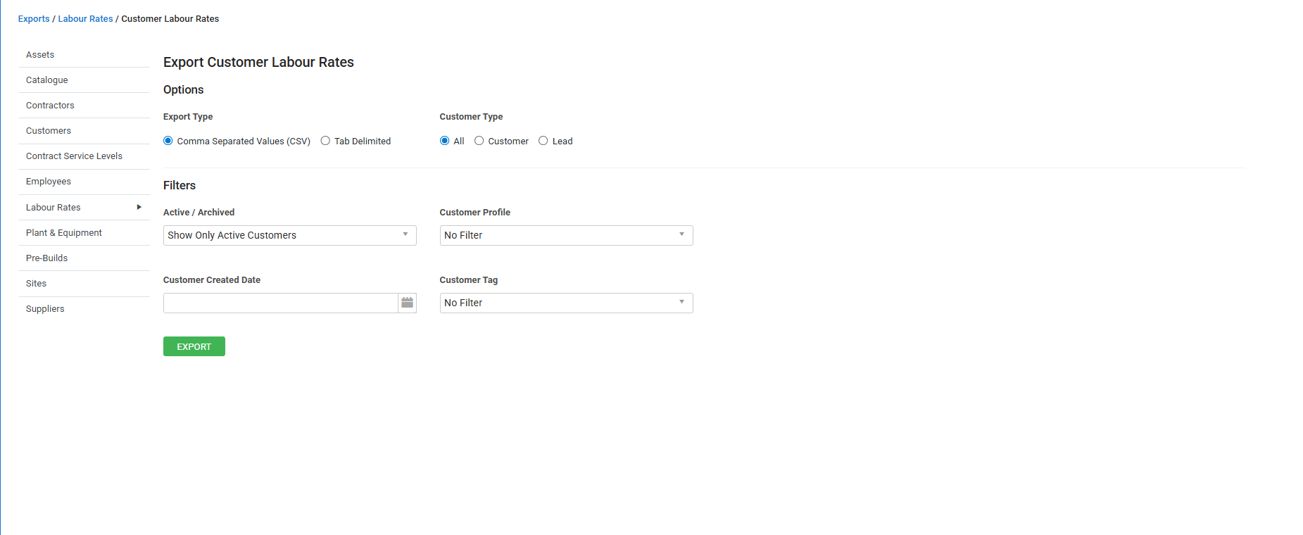 | Export Type | Select to export your customer labour rates list as a CSV or tab delimited file. |