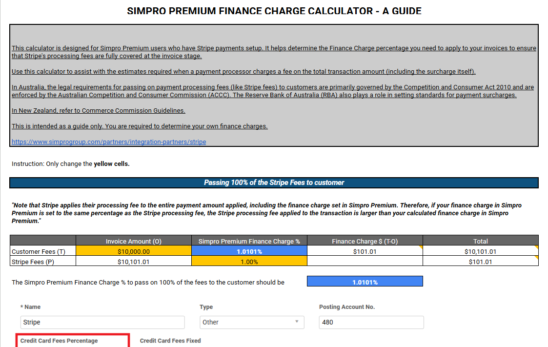 This calculator is designed for Simpro Premium users who have Stripe payments setup. It helps determine the Finance Charge percentage you need to apply to your invoices to ensure that Stripe's processing fees are fully covered at the invoice stage.