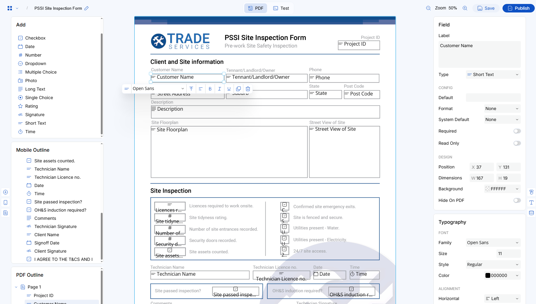 Use Simpro Digital Forms to turn your existing PDF forms into digital forms. You can upload a PDF and align the fields to ensure that your digital form matches your PDF form exactly. Uploading a PDF means you can use your own custom branding, letterhead and replicate official forms.