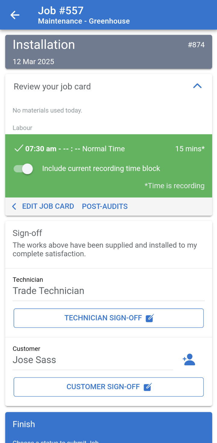 Use the Service module in field to access current project information and manage quote / job work in real time. Field technicians can easily enter clock in and clock off times, parts used, view / upload linked documents, and email job cards when the job is complete.